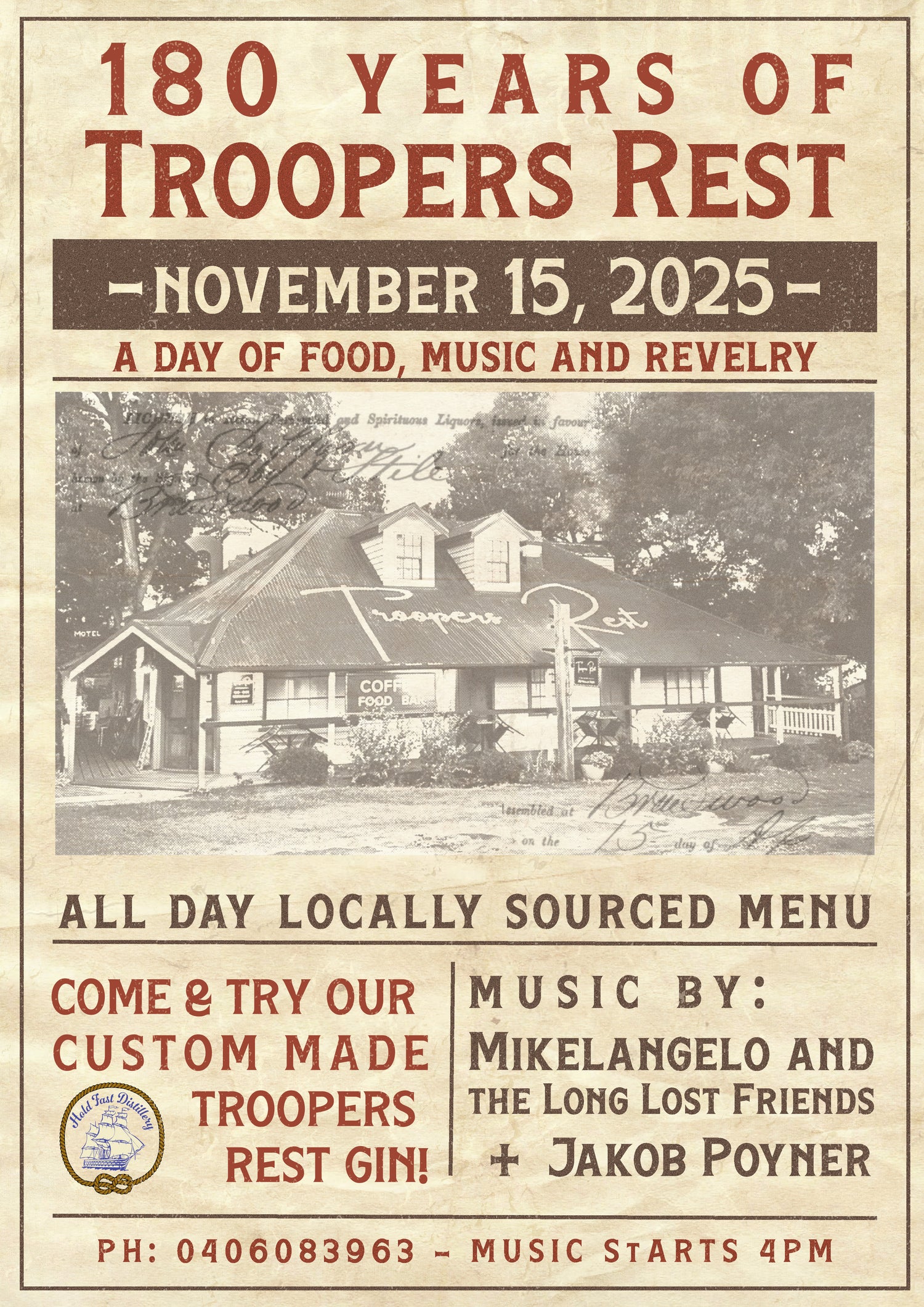 Join us on Saturday 15 November 2025 for a day of great food, local gin and live music. Enjoy an all-day menucelebrating regional produce, the launch of our limited-edition Trooper’s Rest Gin, and live performances from 4 pmfeaturing Mikelangelo and the Long Lost Friends and Jakob Poyner.